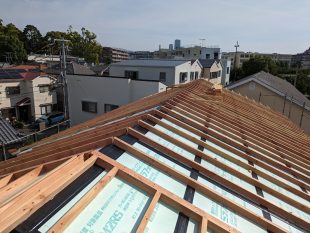 屋根下地完了し、厚さ50ミリの打熱材をはりその間に厚さ40ミリの打熱材を施工していきます。厚さ90ミリとなる断熱材によって屋根がすっぽり覆われます。