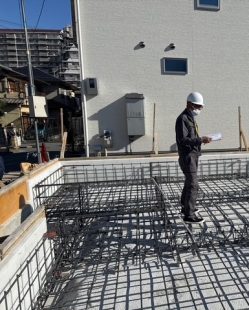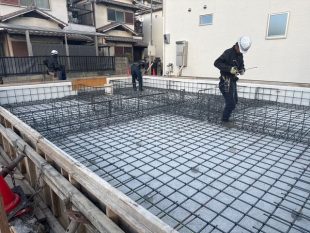 外周型枠の工事が完了後、鉄筋工事を実施、その後、瑕疵担保保険の検査を受けます。